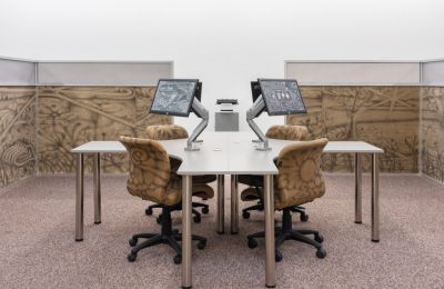 ASMA, Wander & Pursuit, Installation, Wall panels, chairs, printer, blinds, desks, computer screens, vents, carpet, Dimensions variable, 2022. Courtesy of House of Gaga.