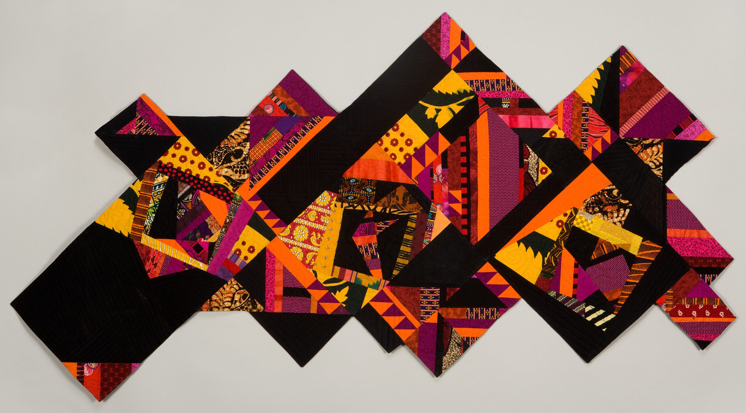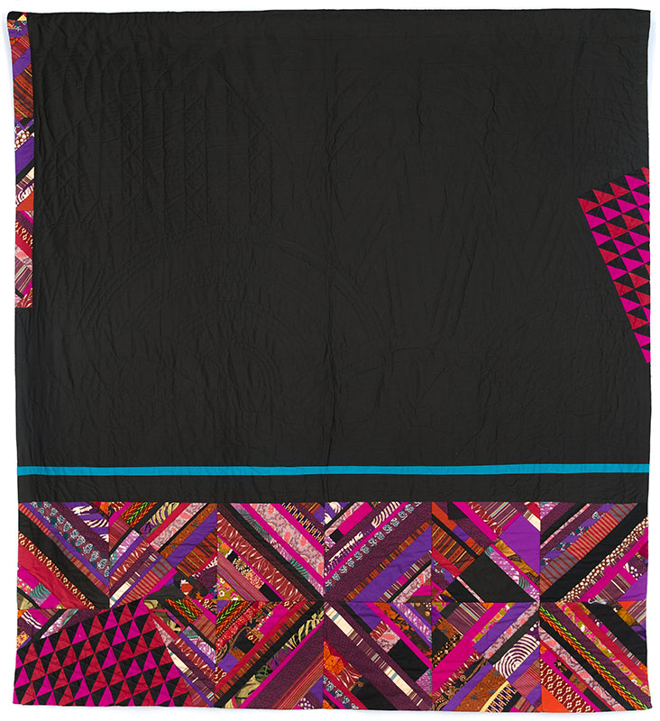 Her background as an interior designer informs her sensitivity to spatial rhythm, composition, and structure, translating the geometries of architecture and the pulse of urban life into textile form. Throughout her career, Harris has chronicled the evolving spirit of Detroit—its ambition, resilience, and reinvention. Her early works from the 1970s and 1980s capture the optimism of a city defined by industrial innovation and social progress. Composed of overlapping fabrics, sharp angles, and rhythmic patterns, these quilts evoke the ordered grids and vivid energy of modern urban landscapes.