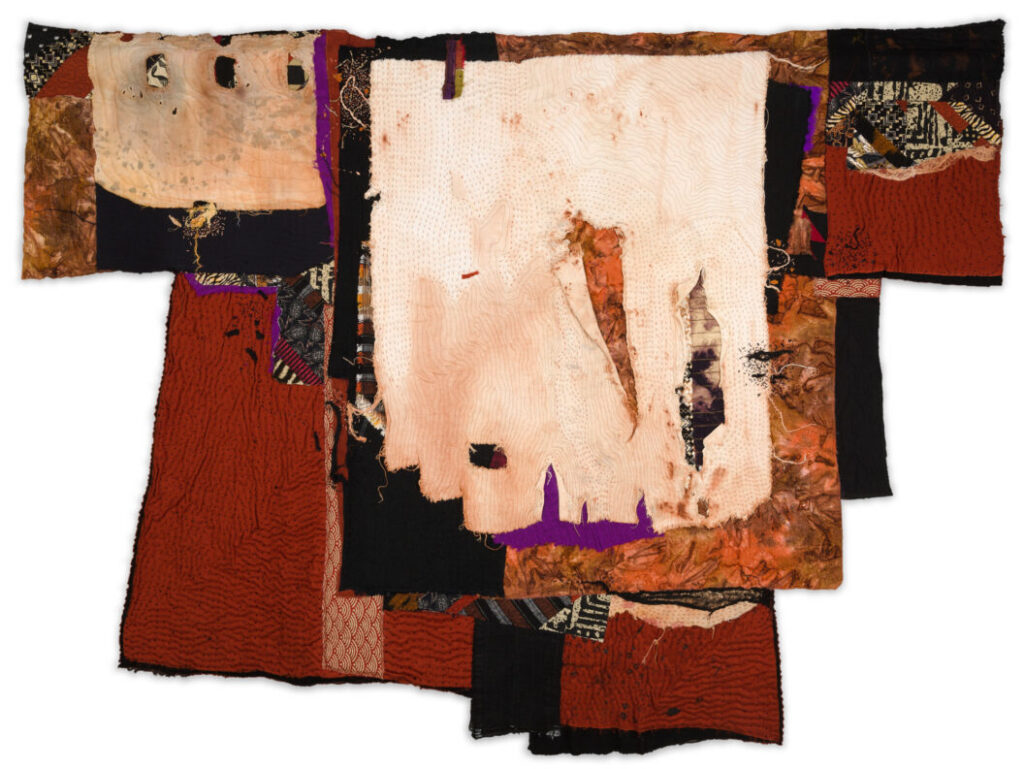In recent years, Harris’s work has evolved toward a more improvisational style rooted in chance, rhythm, and repurposing. Drawing from traditions such as the Japanese boro technique of textile repair, she stitches together fragments of discarded fabric, giving them renewed life and form. Through dyeing, layering, and intentional aging, Harris creates tactile surfaces that hold both memory and motion. Her compositions resonate with the improvisational structures of jazz and the fluidity of lived experience—each piece becoming a meditation on time and resilience.