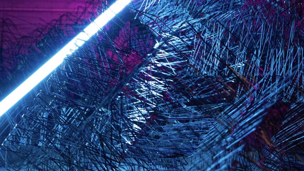 shadowworking features digitally fabricated sculptures that serve as a means to preserve and convey the collective history and stories of communities that have been displaced, like those from Detroit’s Black Bottom neighborhood. Visitors to the exhibition will explore these recreated homes, bathed in an eerie ultraviolet light cast by the ancestral masks. This immersive experience blends elements of a nightclub’s spectacle with the ceremony of an altar, giving rise to a unique encounter best described as embodying the concept of “Hoodoo tectonics.”